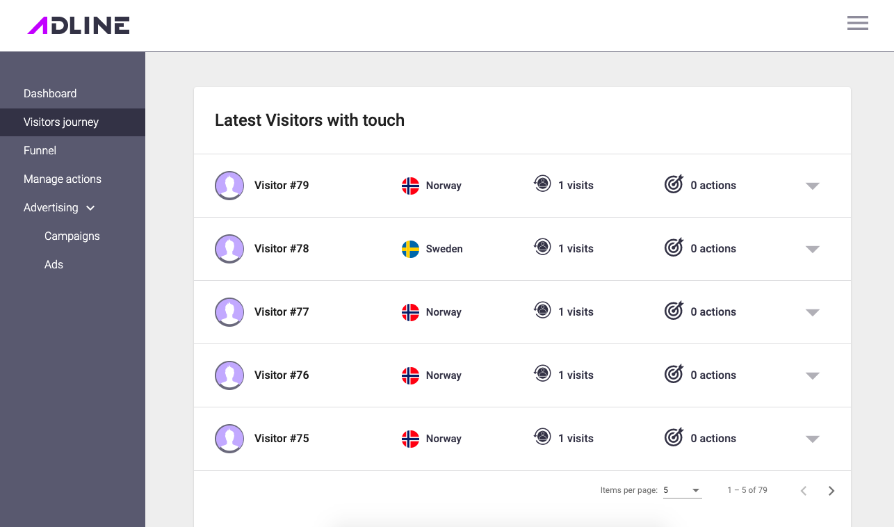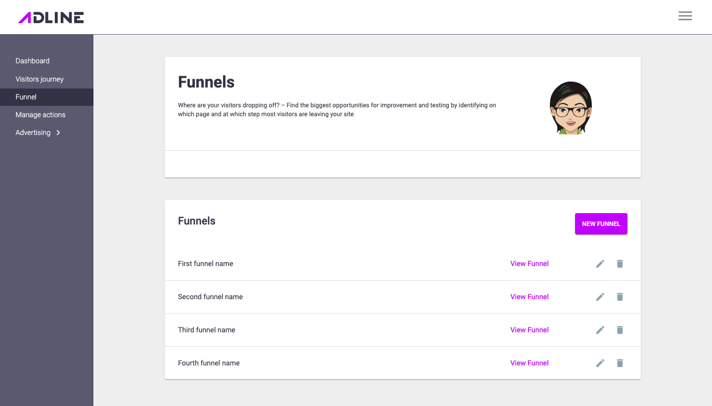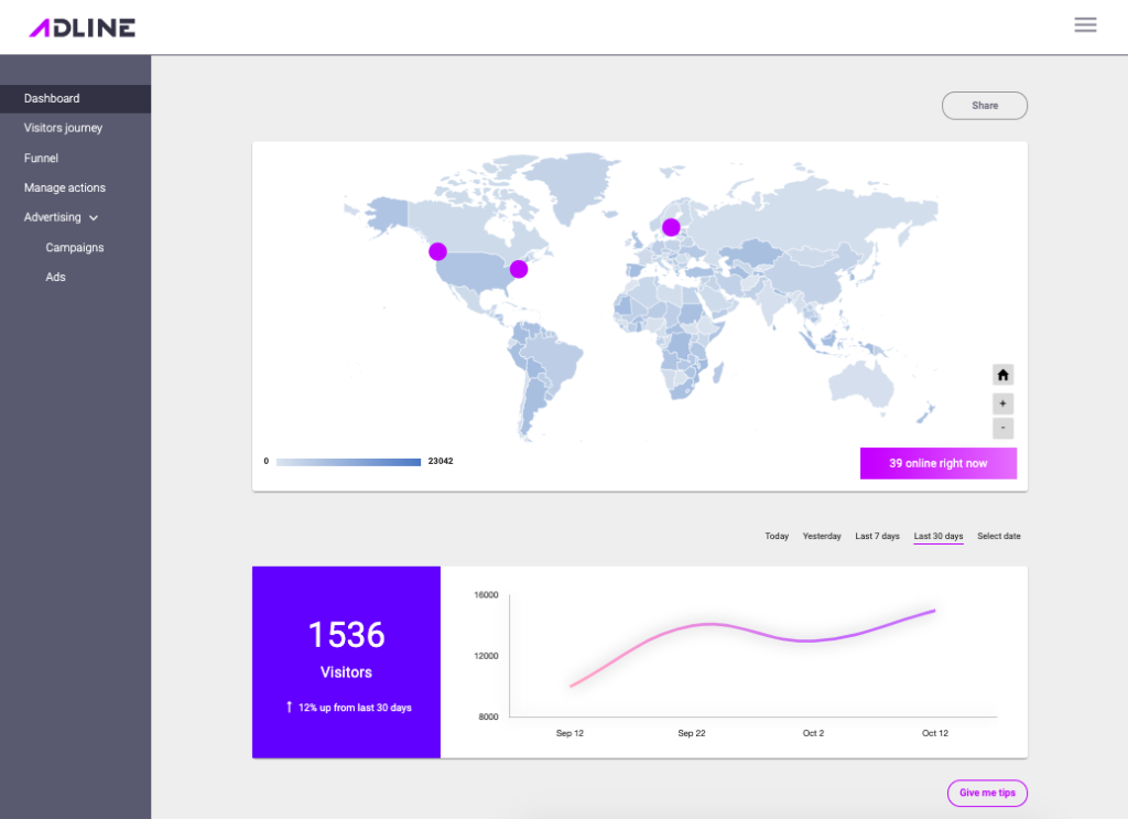 On the Adline Dashboard, you’ll get an overview of traffic sources, visitors, conversions, Cost Per Acquisition, page performance, funnels and more. Here you’ll meet Elena as well – and she will give you actionable advice!